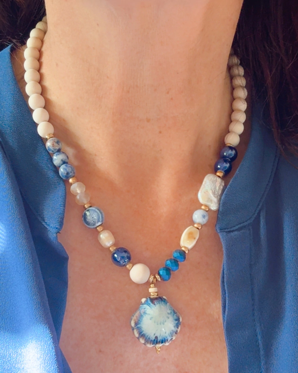 El Collar Fiji es puro color, textura y movimiento. De largo medio y con un diseño central súper original, combina cuentas de vidrio, piedra y cerámica, realzadas por una perla de agua dulce que le da un toque fresco y natural. El detalle final: un dije de cerámica en forma de shell, que evoca lo mejor de los días al sol.