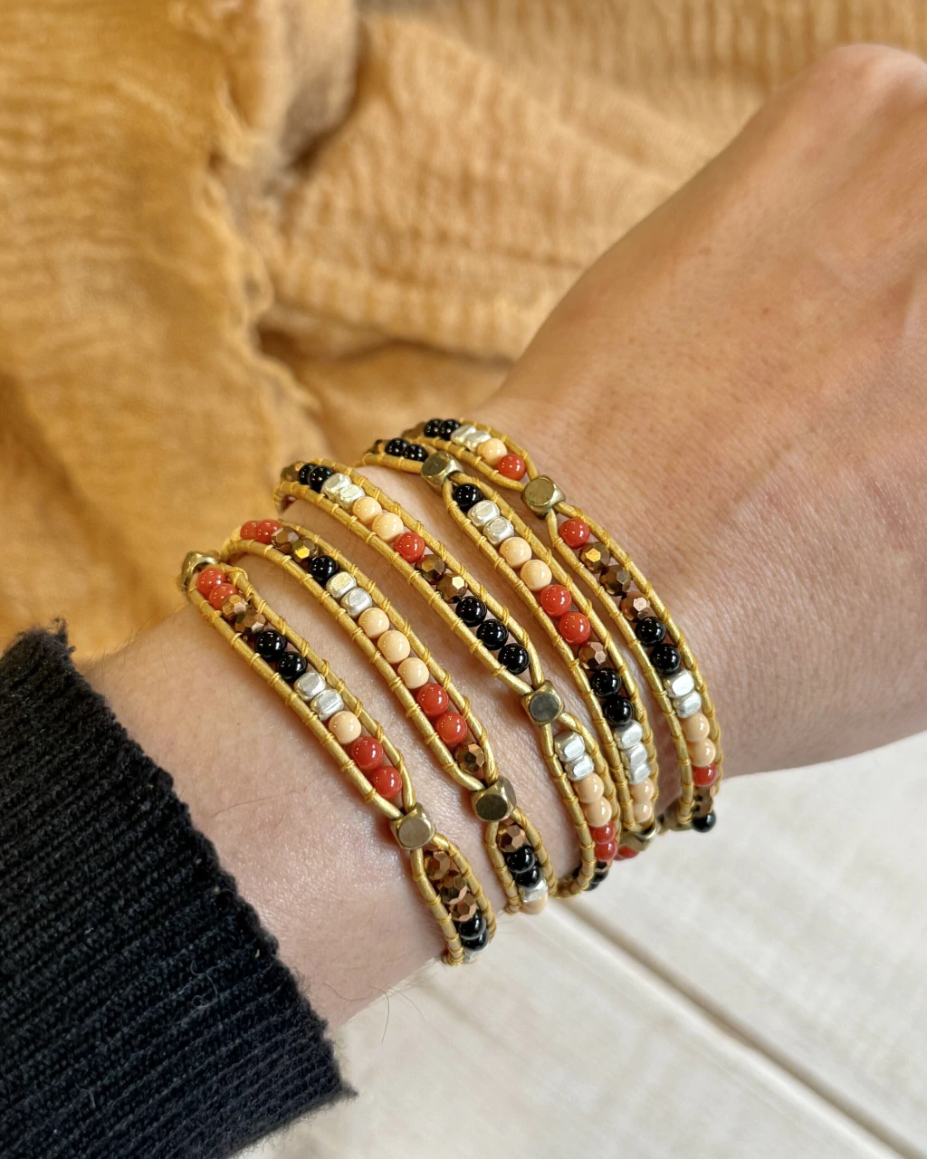 Sumá estilo y color a tu look con esta pulsera de 5 vueltas, hecha con cordón de cuero y pequeñas cuentas cuidadosamente enhebradas en colores armoniosos que combinan entre sí.