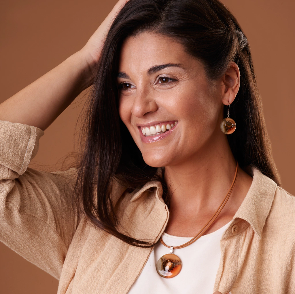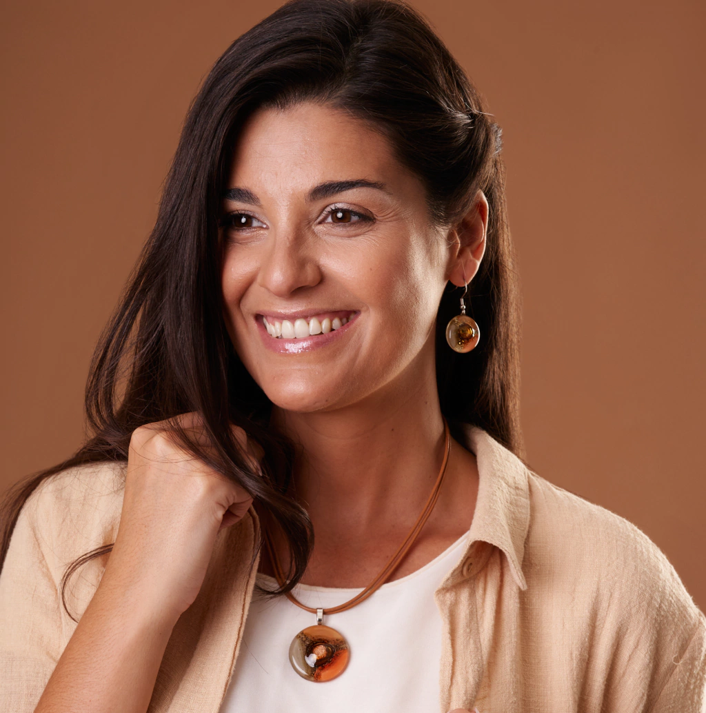 Menos es más… y Candy lo demuestra. Su dije redondo de vidrio fusionado (3,5 cm) pintado a mano en nuestro taller tiene ese toque único que solo Cristálida sabe darle.