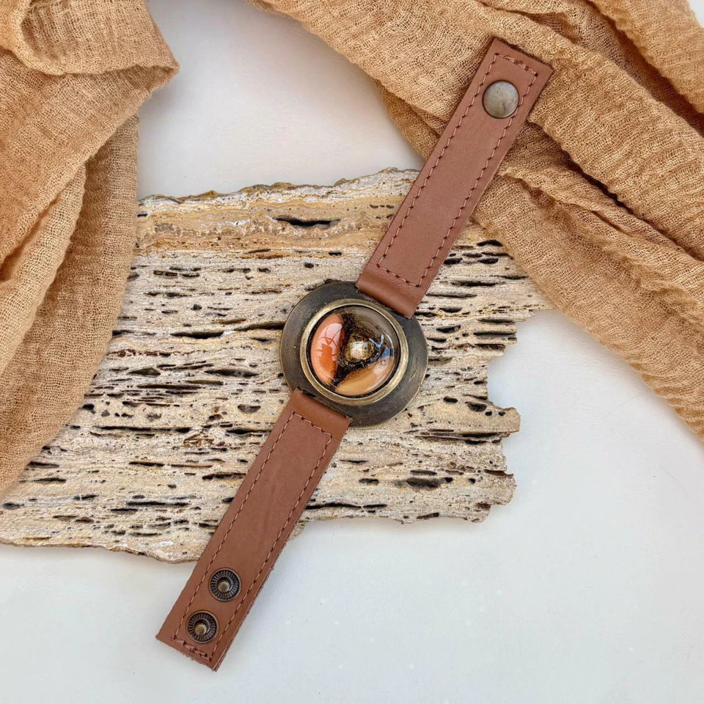 Importante brazalete realizado en cuero genuino 🐄, forrado y cosido. El aplique de metal con pieza de vidrio pintada a mano 🎨 armoniza con los colores del cuero y es curvo para adaptarse perfectamente a la muñeca.