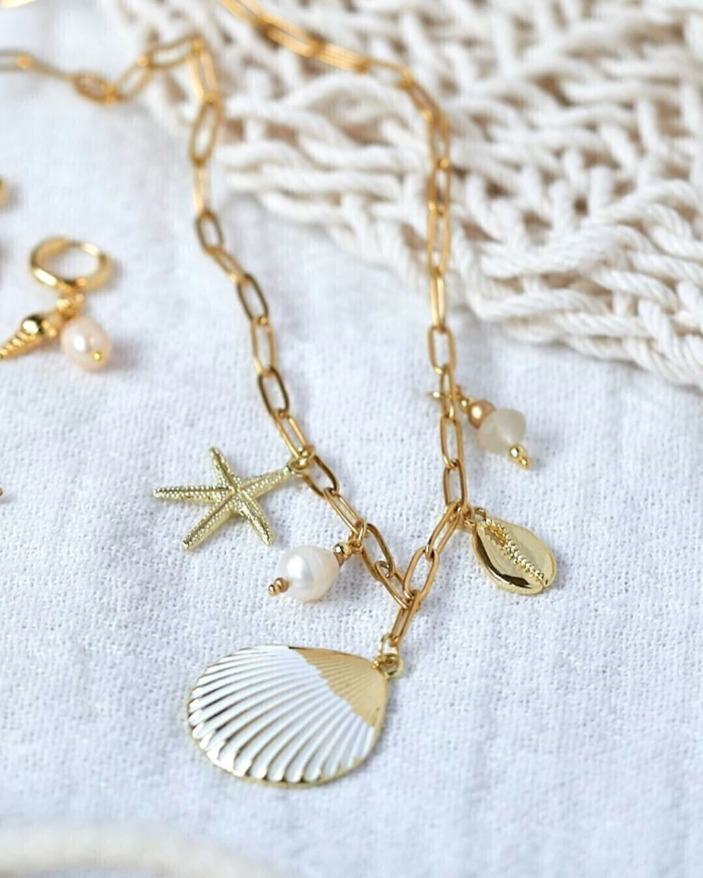 Each charm is different: they can be made of metal, freshwater pearls, stone, glass, or ceramic, but all harmonize in color or theme. The result: a necklace full of personality, joy, and youthful style that can be worn at any age.