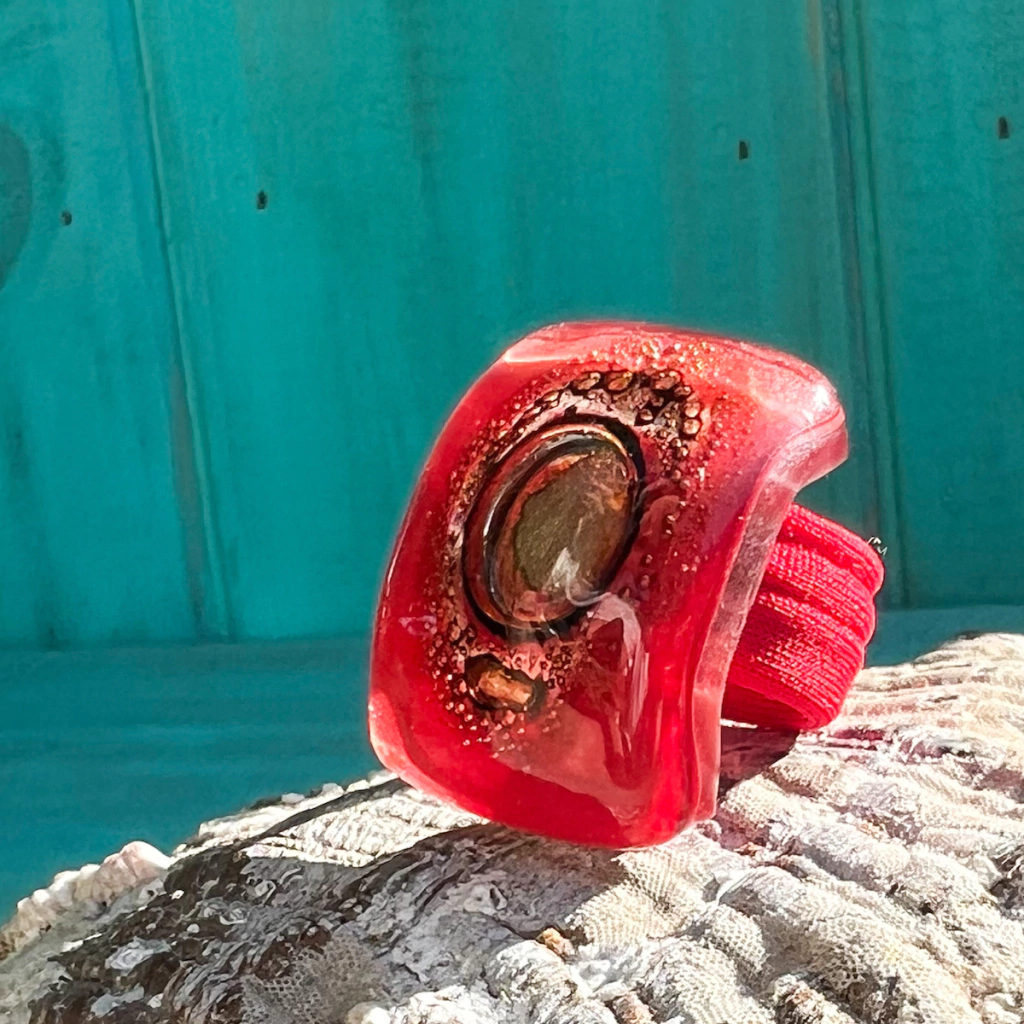 Realizado con una pieza importante de vidrio fusionado, pintado a mano y montado en base pasante con lycra elastizada para un calce cómodo y adaptable.