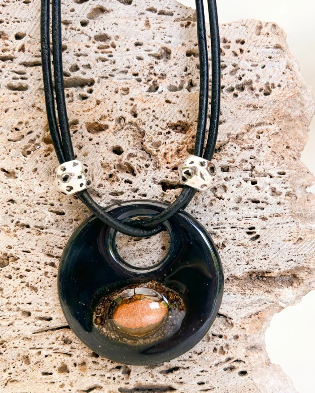 Un collar de cuero y vidrio pintado a mano que tiene onda propia.