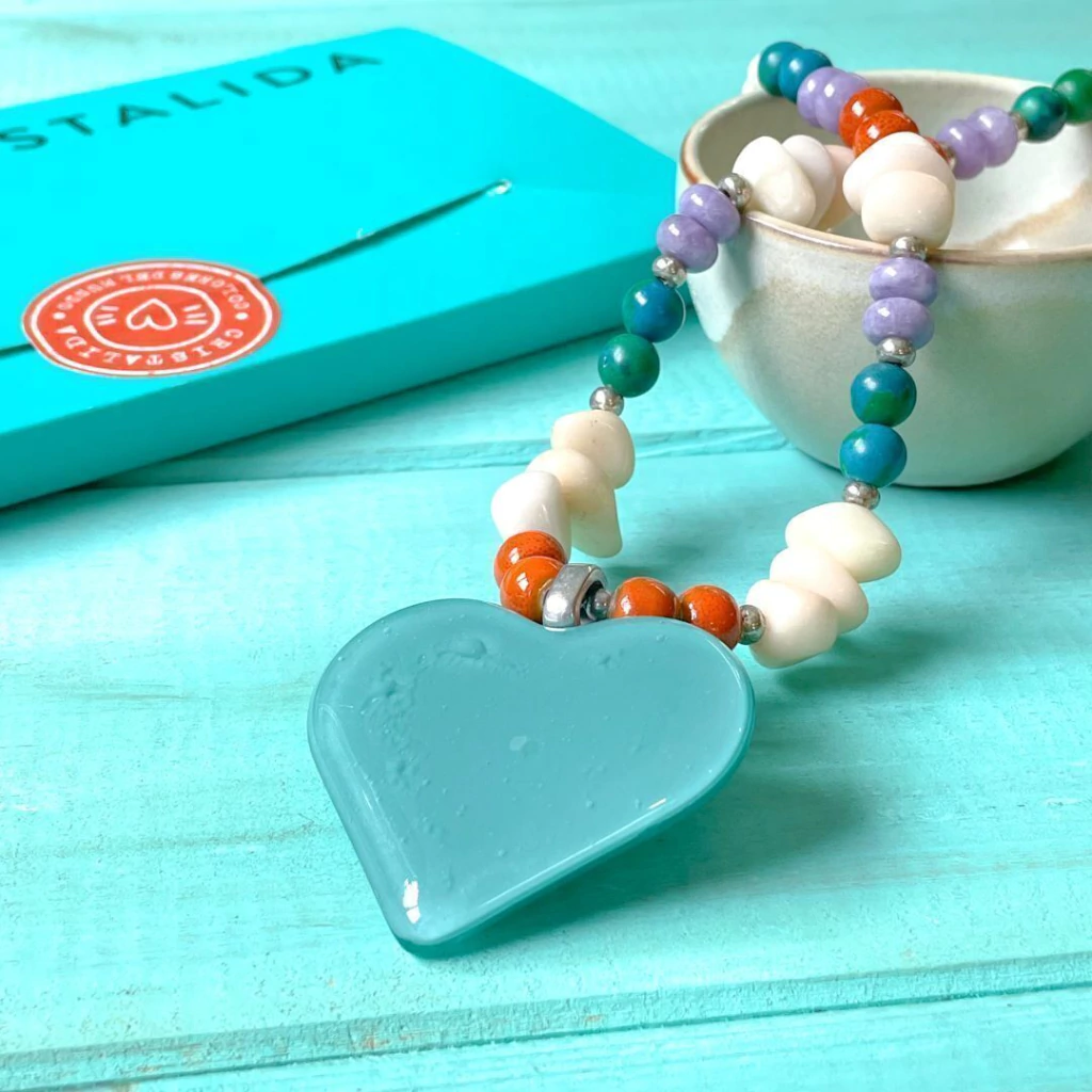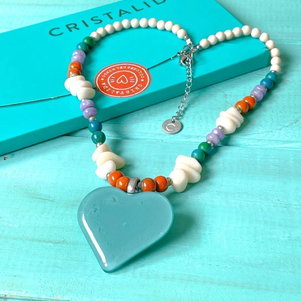 De largo medio y con pura energía primaveral, Cerdeña es ese collar que ilumina tu look al instante. Su dije central, un corazón de vidrio pintado a mano en color pleno (azul, turquesa, verde lima o coral), se combina con escallas de piedra natural y una mezcla única de piedras y cerámicas en tres tonos que generan un contraste vibrante y original.